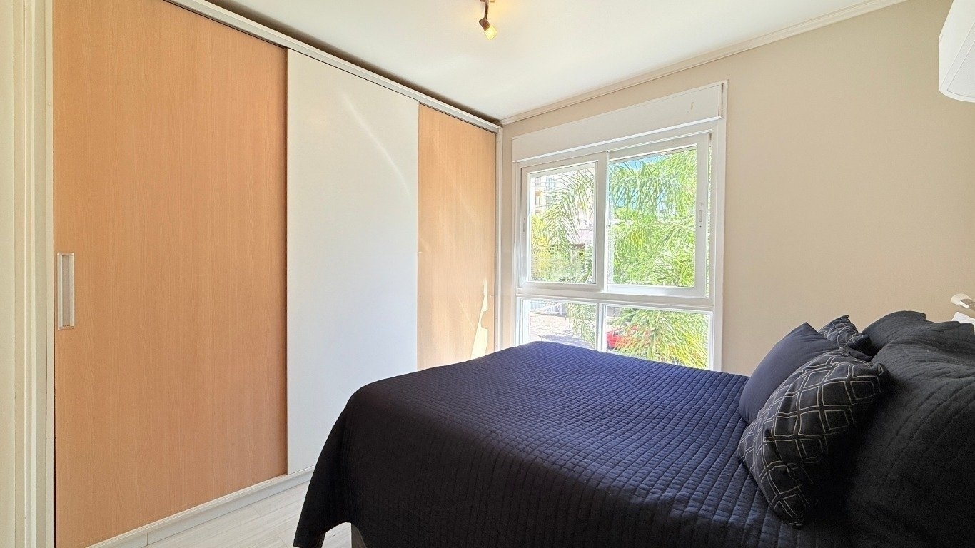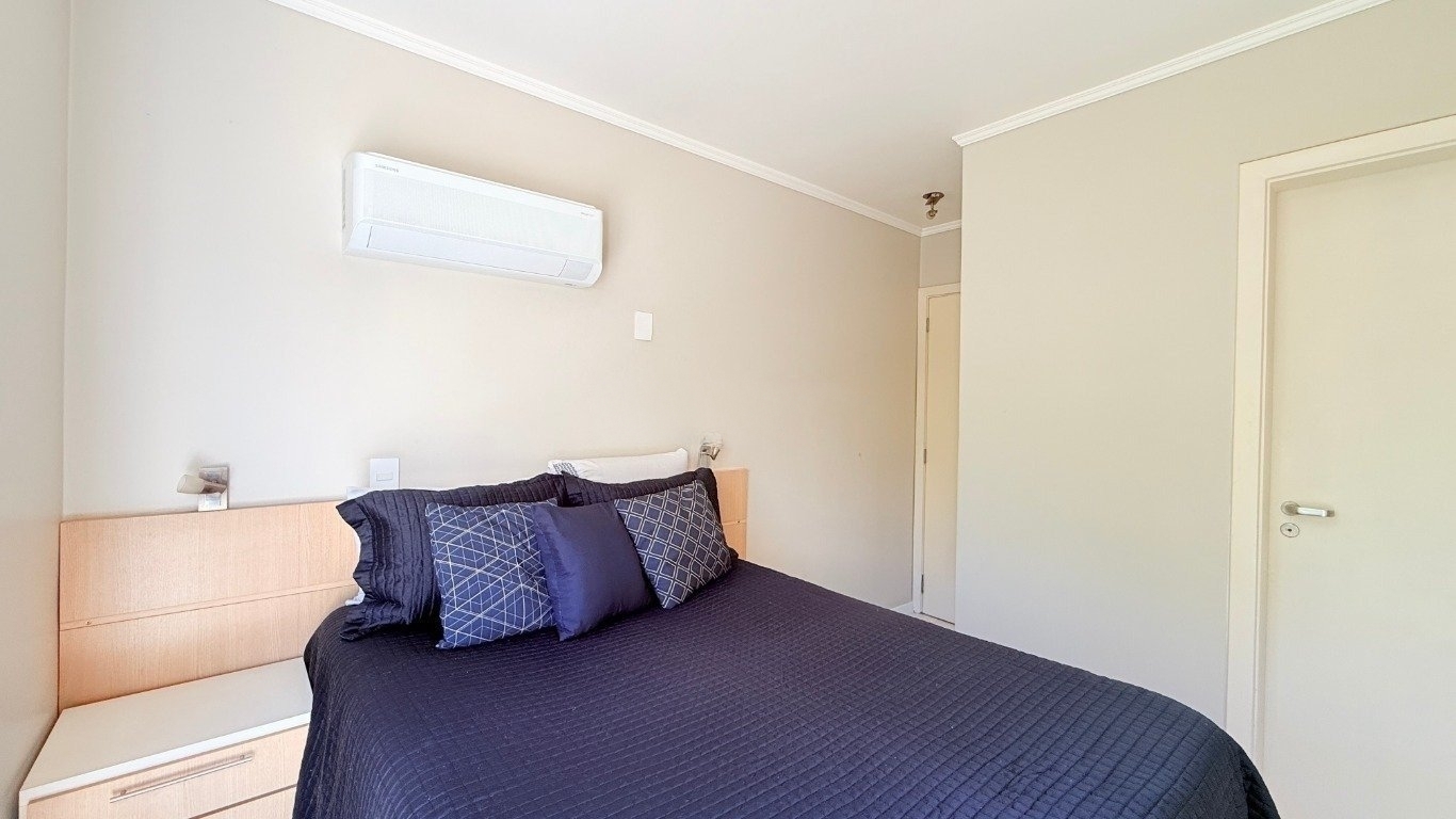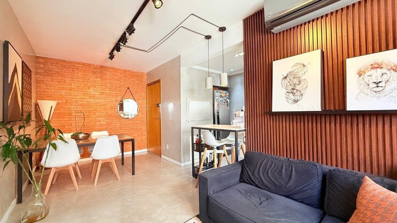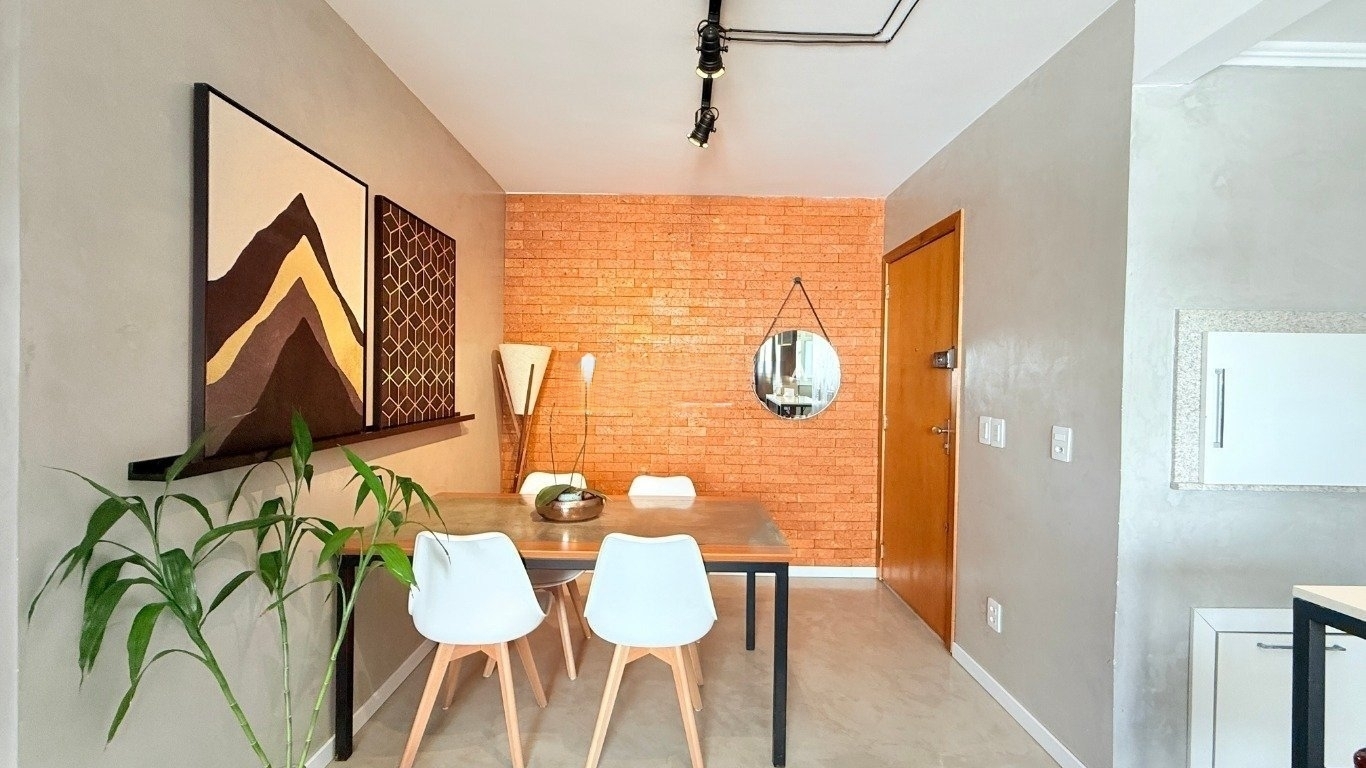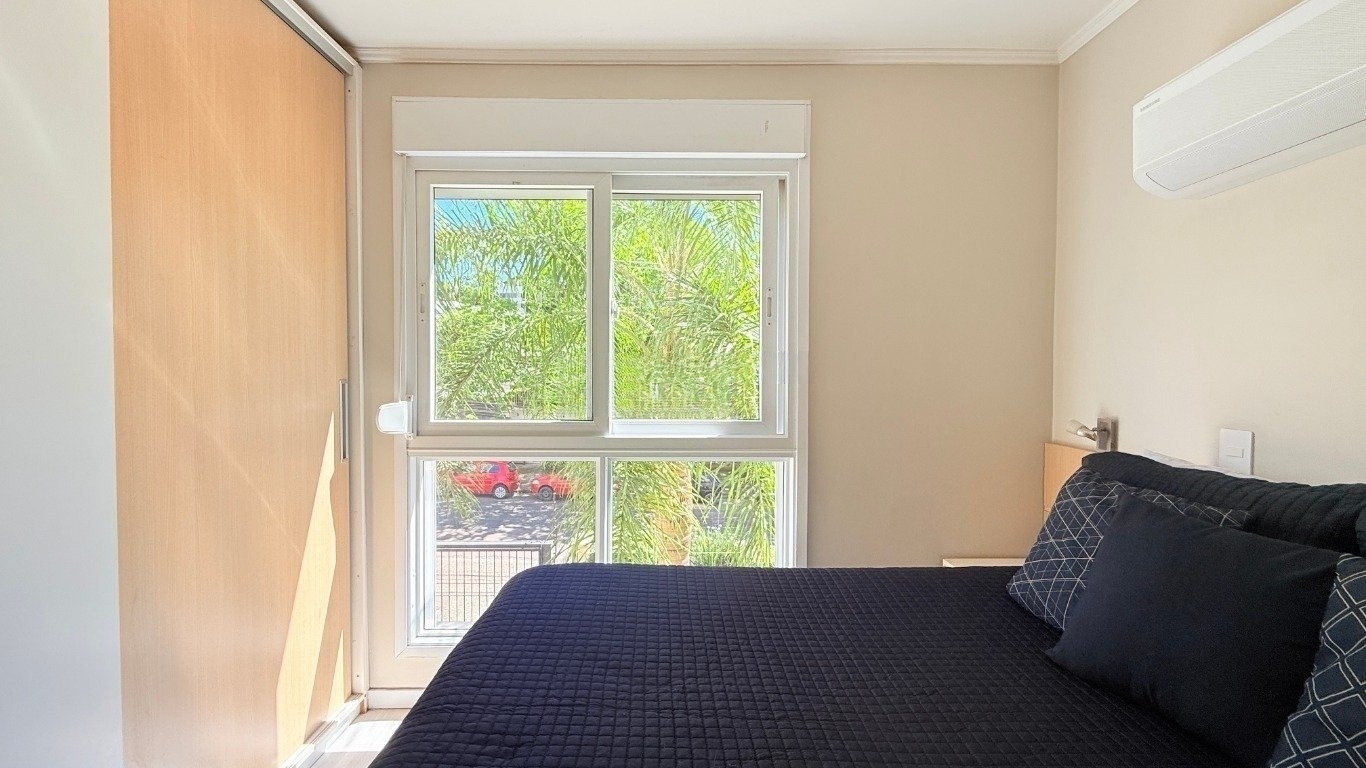 apartamento de 2d com garagem mobiliado Com 59m de área privativa, o imóvel oferece um living acolhedor e bem decorado, com sofá, split, rack com TV e mesa com cadeiras, criando um ambiente convidativo para relaxar e receber amigos. A cozinha planejada é completa, equipada com armários sob medida, fogão, geladeira e churrasqueira, ideal para quem valoriza praticidade no dia a dia. São dois dormitórios, sendo uma suíte com cama de casal, armário planejado e split, e o segundo dormitório que pode ser adaptado como escritório para home office ou utilizado conforme sua necessidade. O banheiro social conta com box de vidro e armário, garantindo conforto e funcionalidade. O condomínio oferece infraestrutura completa,